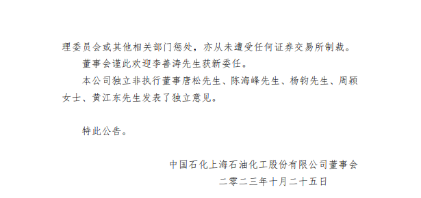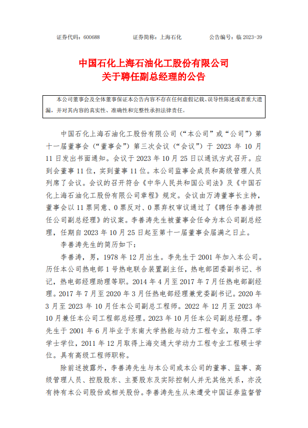 中國石化上海石油化工股份有限公司近日發(fā)布公告,聘任李善濤為該公司副總經(jīng)理。