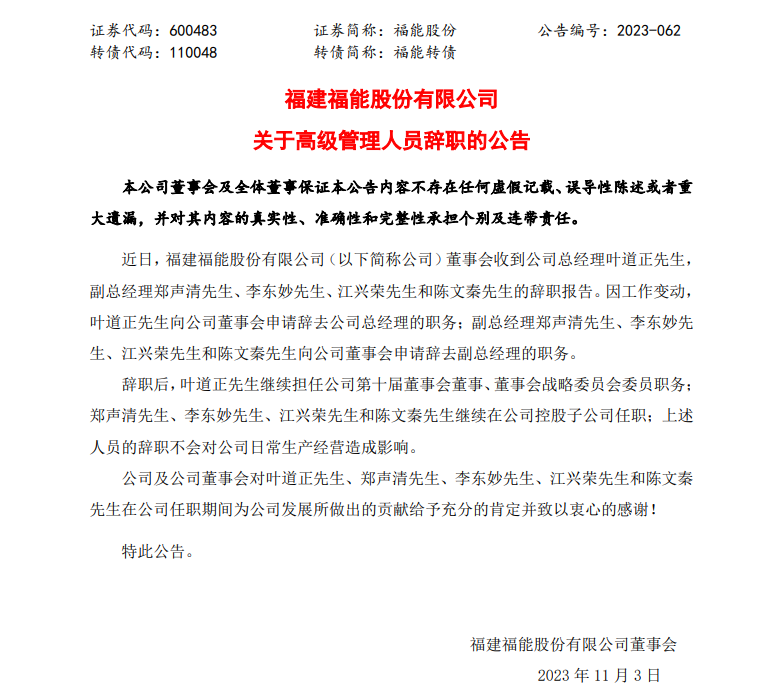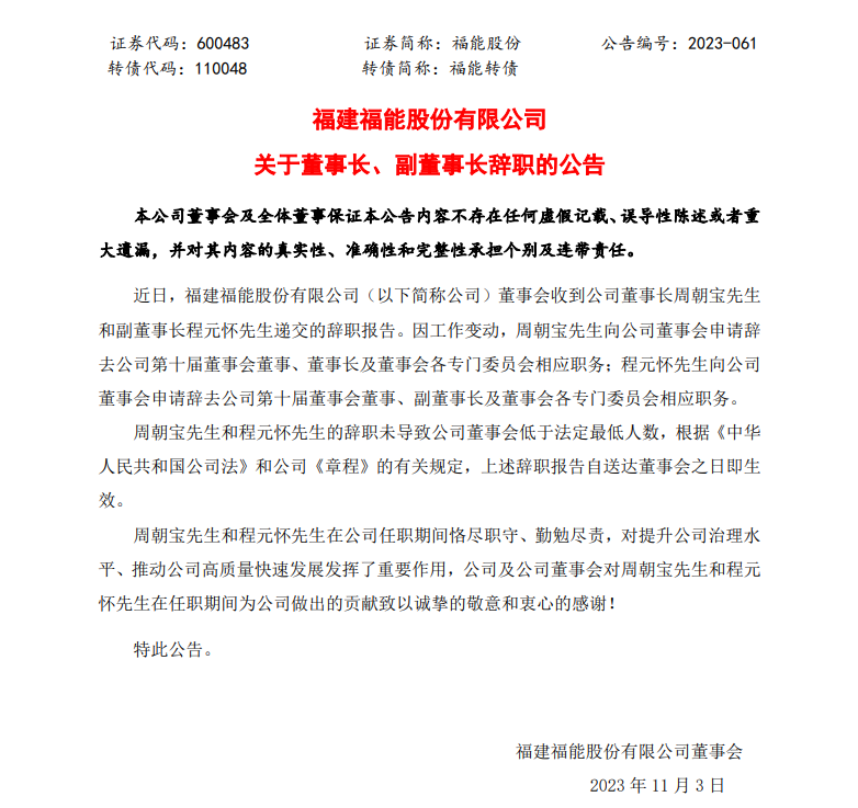 11月3日,福建福能股份有限公司發(fā)布兩則公告,該公司董事長、總經(jīng)理等多名高級管理人員辭去相應職務。