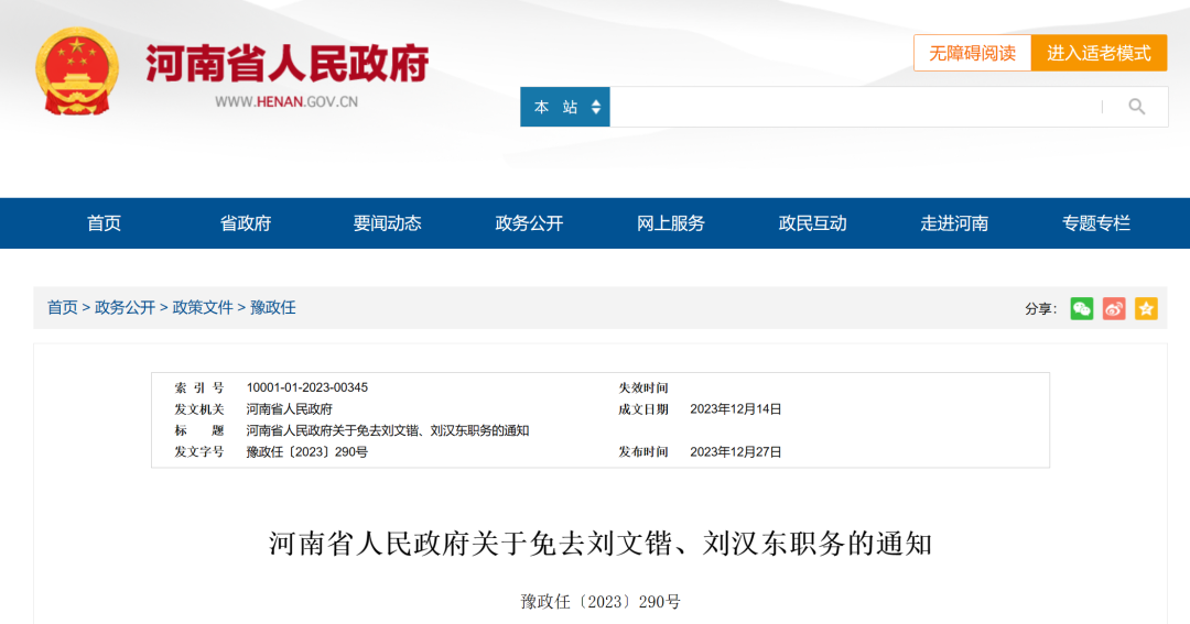 12月27日,河南省人民政府發(fā)布通知稱,免去劉文鍇的華北水利水電大學(xué)校長(zhǎng)職務(wù);免去劉漢東的華北水利水電大學(xué)副校長(zhǎng)職務(wù)。