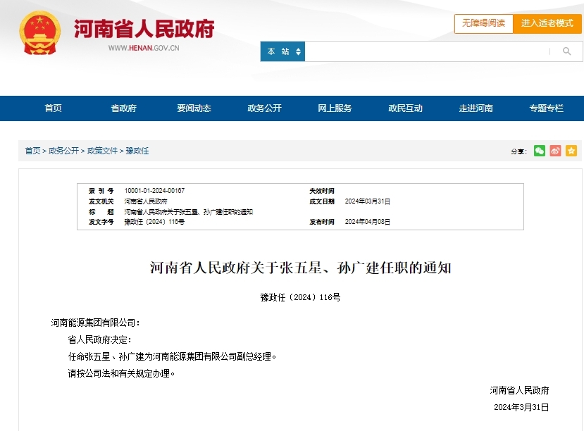 任命張五星、孫廣建為河南能源集團(tuán)有限公司副總經(jīng)理。