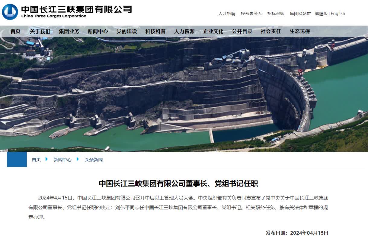 2024年4月15日,中國(guó)長(zhǎng)江三峽集團(tuán)有限公司召開中層以上管理人員大會(huì)。中央組織部有關(guān)負(fù)責(zé)同志宣布了黨中央關(guān)于中國(guó)長(zhǎng)江三峽集團(tuán)有限公司董事長(zhǎng)、黨組書記任職的決定:劉偉平同志任中國(guó)長(zhǎng)江三峽集團(tuán)有限公司董事長(zhǎng)、黨組書記。相關(guān)職務(wù)任免,按有關(guān)法律和章程的規(guī)定辦理。