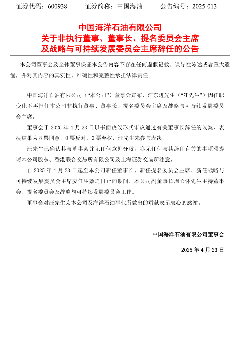 4月23日,中國海油公告,汪東進(jìn)因任職變化不再擔(dān)任公司非執(zhí)行董事、董事長(zhǎng)、提名委員會(huì)主席及戰(zhàn)略與可持續(xù)發(fā)展委員會(huì)主席。