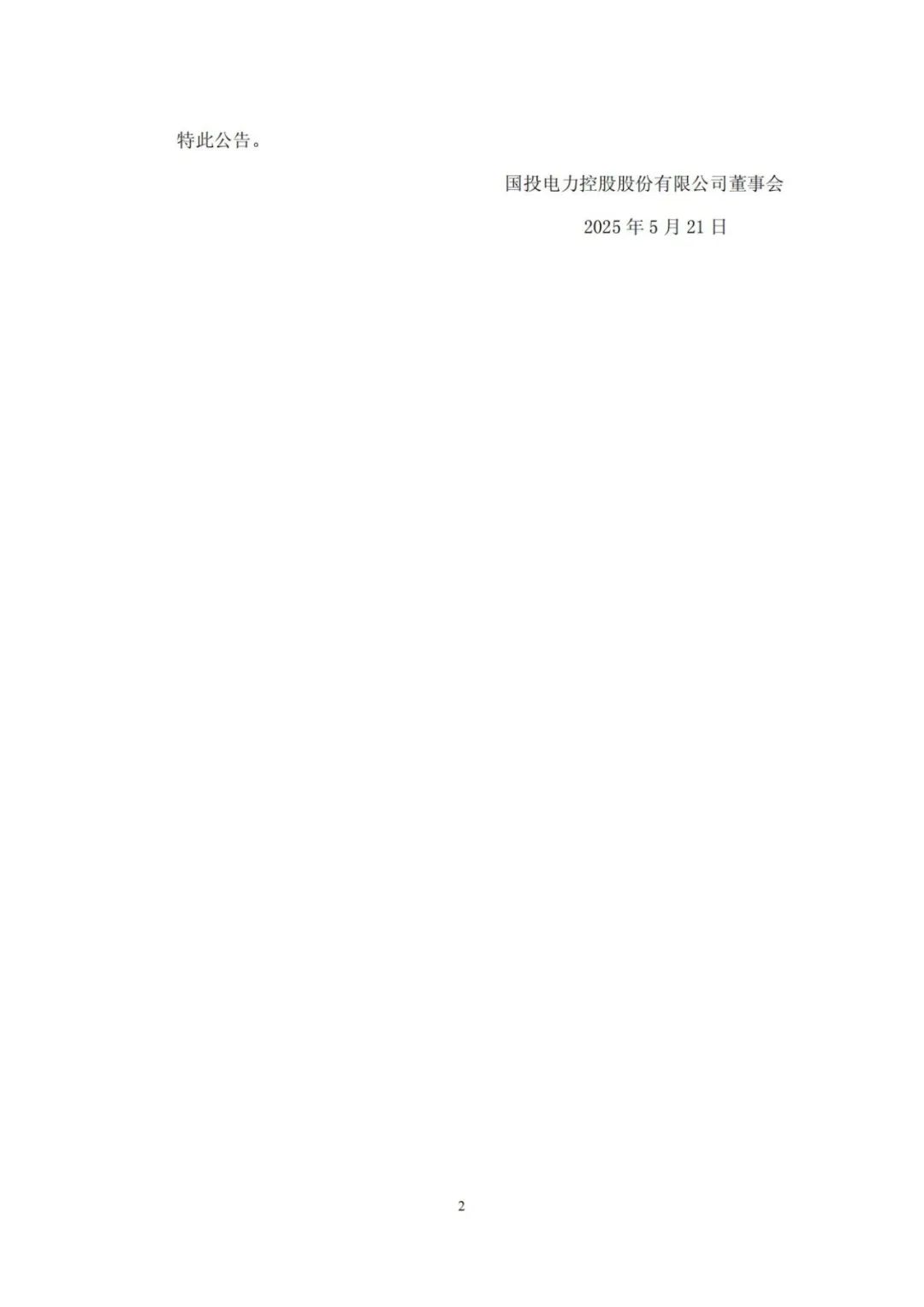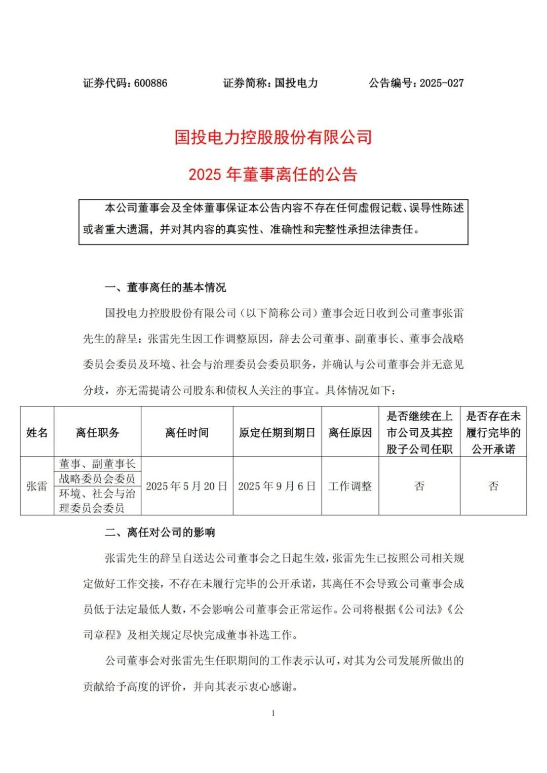 5月21日,國投電力發(fā)布公告稱,公司董事會(huì)近日收到公司董事張雷的辭呈:張雷因工作調(diào)整原因,辭去公司董事、副董事長(zhǎng)、董事會(huì)戰(zhàn)略委員會(huì)委員及環(huán)境、社會(huì)與治理委員會(huì)委員職務(wù),并確認(rèn)與公司董事會(huì)并無意見分歧,亦無需提請(qǐng)公司股東和債權(quán)人關(guān)注的事宜。