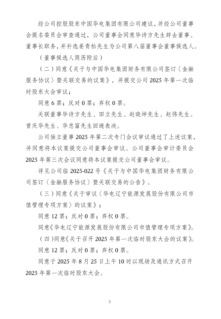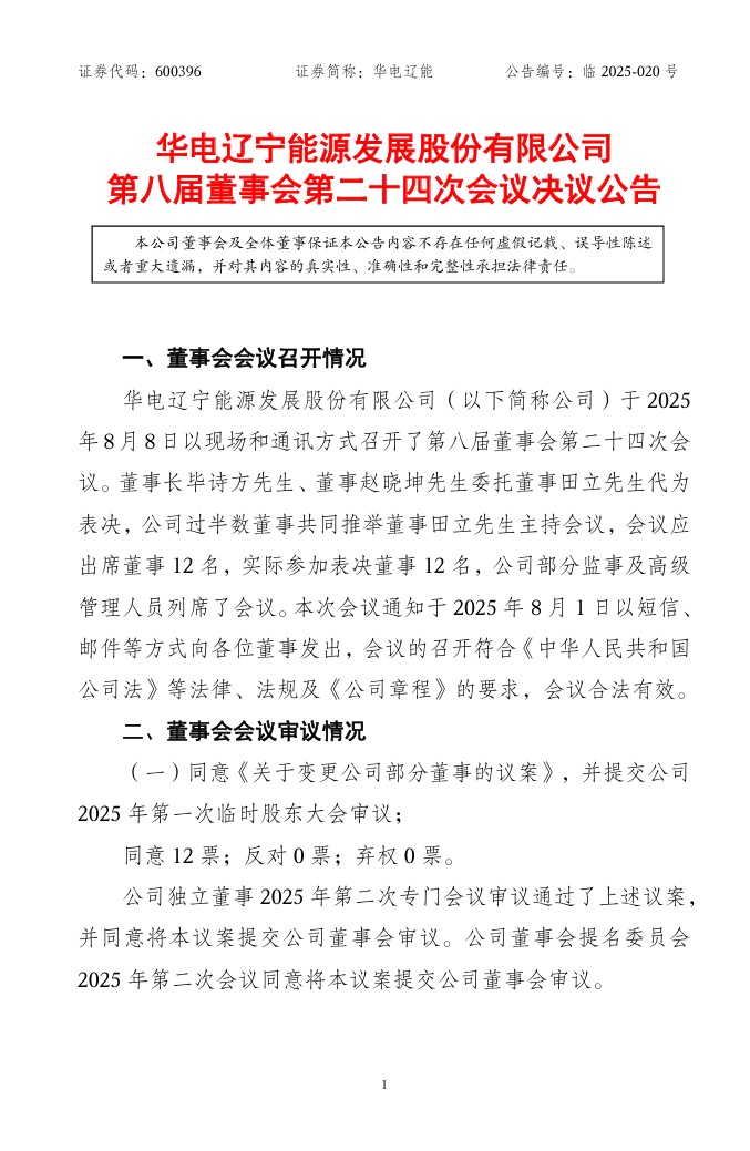 華電遼寧能源發(fā)展股份有限公司發(fā)布公告稱,公司于8月8日召開第八屆董事會(huì)第二十四次會(huì)議,同意《關(guān)于變更公司部分董事的議案》。經(jīng)公司控股股東中國(guó)華電集團(tuán)有限公司建議,并經(jīng)公司董事會(huì)提名委員會(huì)審查通過,公司董事會(huì)同意畢詩方先生辭去董事、董事長(zhǎng)職務(wù),并補(bǔ)選姜青松先生為公司第八屆董事會(huì)董事候選人。
