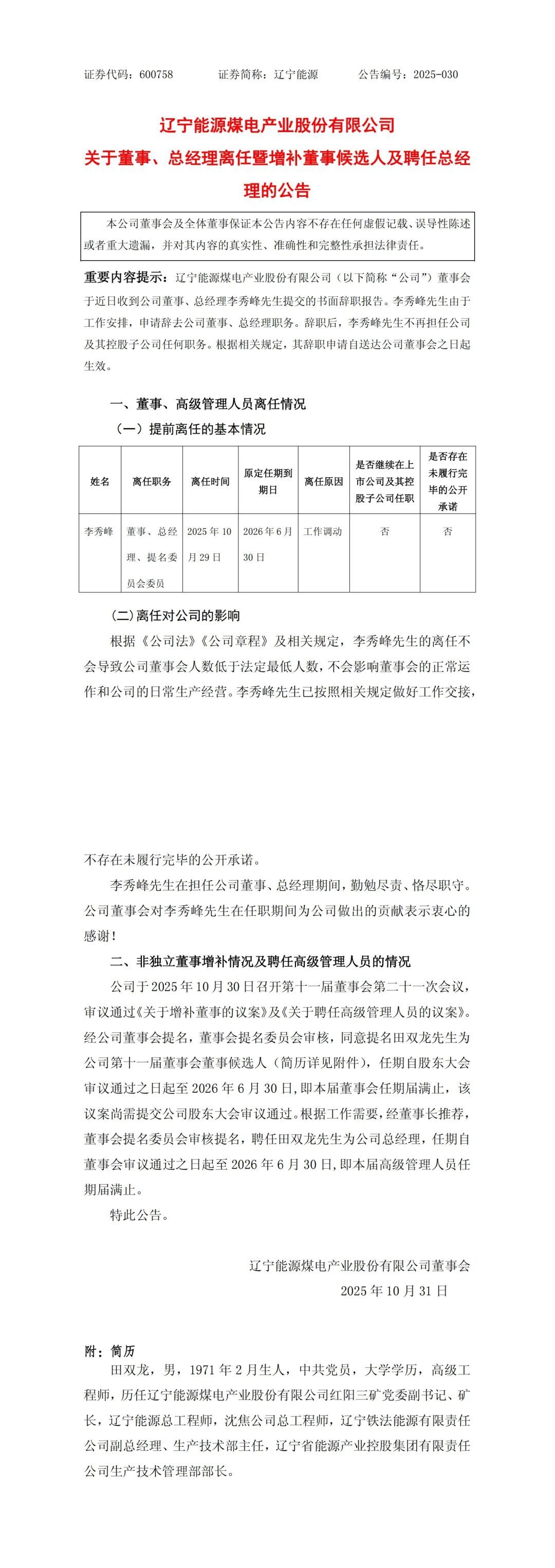 10月31日,遼寧能源發(fā)布公告,董事會于近日收到公司董事、總經(jīng)理李秀峰先生提交的書面辭職報告。李秀峰先生由于工作安排,申請辭去公司董事、總經(jīng)理職務(wù)。辭職后,李秀峰先生不再擔(dān)任公司及其控股子公司任何職務(wù)。根據(jù)相關(guān)規(guī)定,其辭職申請自送達(dá)公司董事會之日起生效。