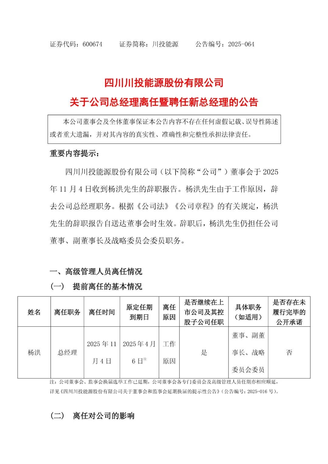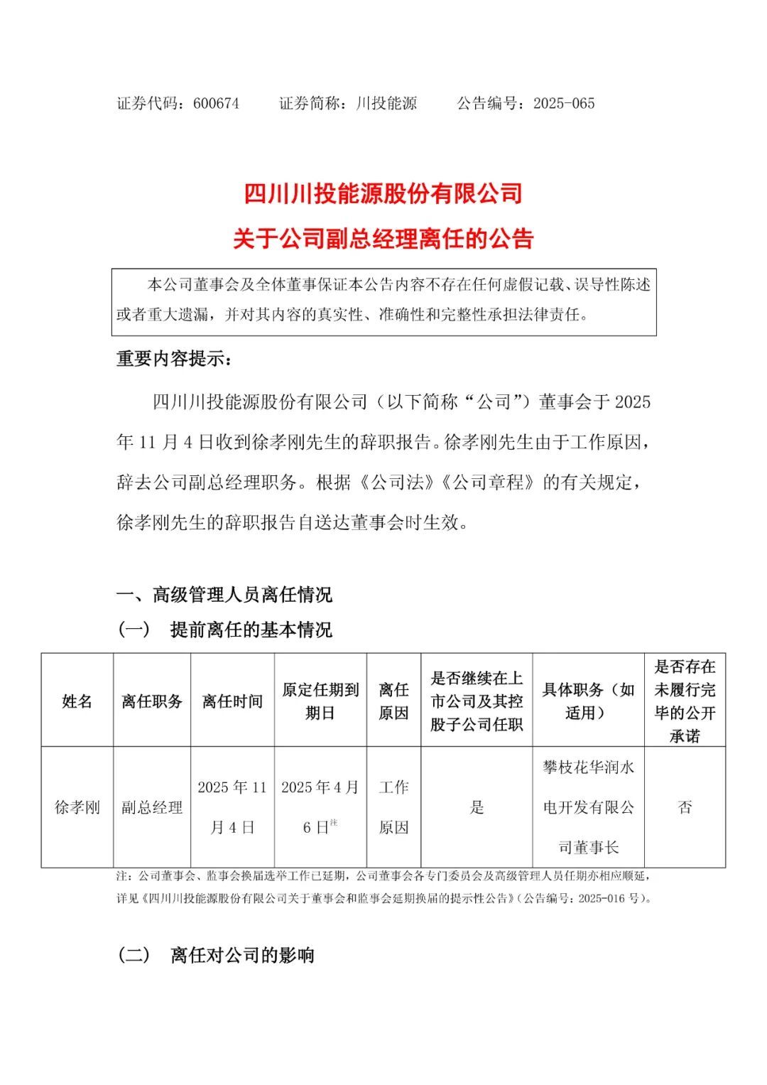 同日,川投能源公告稱(chēng),公司董事會(huì)于2025年11月4日收到徐孝剛的辭職報(bào)告。徐孝剛由于工作原因,辭去公司副總經(jīng)理職務(wù)。