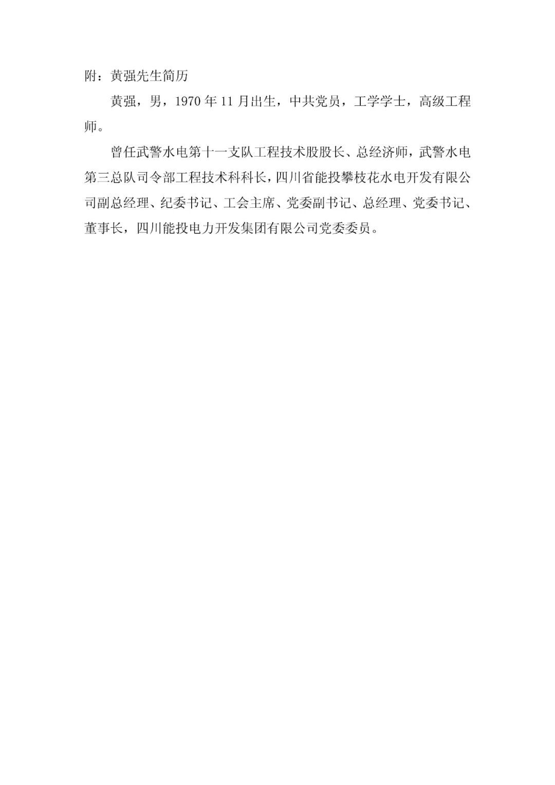 黃強(qiáng),男,1970年11月出生,中共黨員,工學(xué)學(xué)士,高級(jí)工程師。曾任武警水電第十一支隊(duì)工程技術(shù)股股長(zhǎng)、總經(jīng)濟(jì)師,武警水電第三總隊(duì)司令部工程技術(shù)科科長(zhǎng),四川省能投攀枝花水電開(kāi)發(fā)有限公司副總經(jīng)理、紀(jì)委書(shū)記、工會(huì)主席、黨委副書(shū)記、總經(jīng)理、黨委書(shū)記、董事長(zhǎng),四川能投電力開(kāi)發(fā)集團(tuán)有限公司黨委委員。