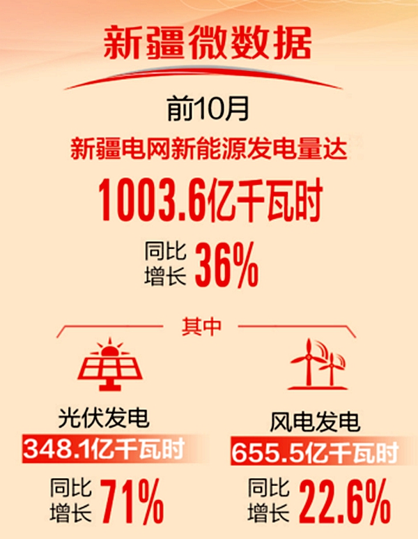 前10月,新疆電網(wǎng)光伏發(fā)電348.1億千瓦時(shí),同比增長(zhǎng)71%;風(fēng)電發(fā)電655.5億千瓦時(shí),同比增長(zhǎng)22.6%。在前10月新增的發(fā)電量中,有八成是新能源發(fā)電量。