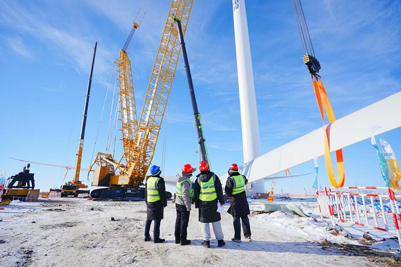 施工過(guò)程中,項(xiàng)目團(tuán)隊(duì)時(shí)刻關(guān)注天氣變化,克服今冬首場(chǎng)寒潮影響,通過(guò)科學(xué)施工組織、周密作業(yè)準(zhǔn)備、嚴(yán)格質(zhì)量檢驗(yàn),連續(xù)施工40小時(shí),成功對(duì)接機(jī)艙和葉輪,圓滿完成首臺(tái)風(fēng)機(jī)吊裝作業(yè)。