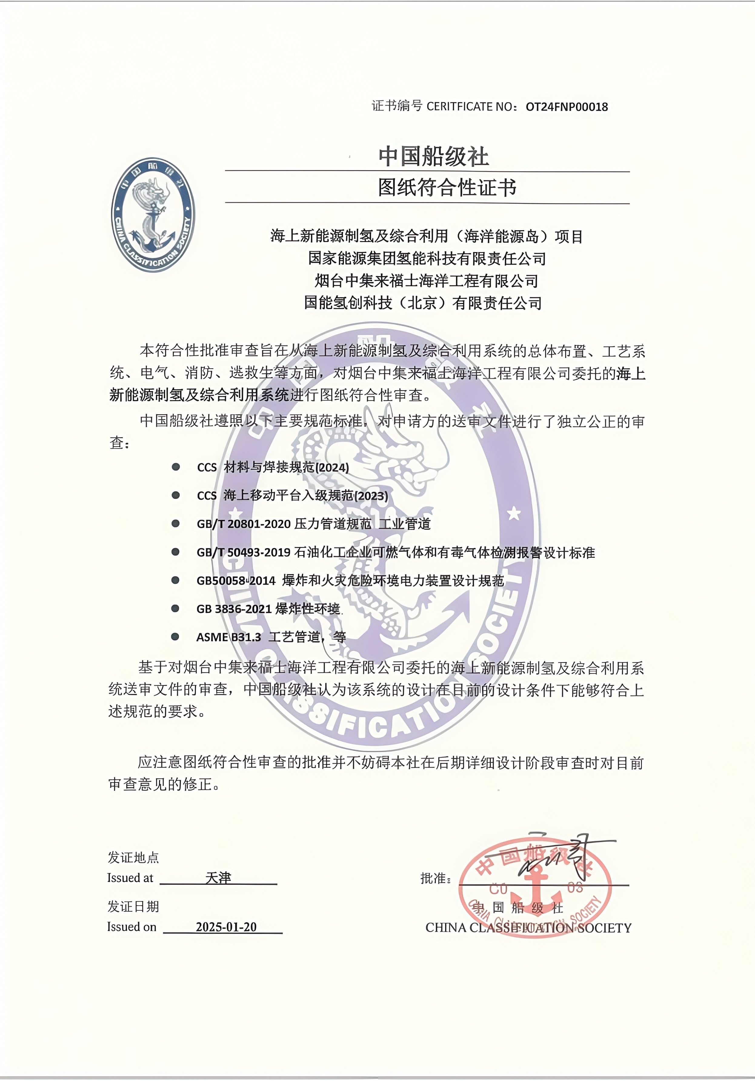 中國能源新聞網(wǎng)訊 (記者 曲藝)1月20日,在山東煙臺(tái)海域,由國家能源集團(tuán)氫能科技有限責(zé)任公司、煙臺(tái)中集來福士海洋工程有限公司和國能氫創(chuàng)科技(北京)有限公司共建的海上新能源制氫及綜合利用(海洋能源島)項(xiàng)目通過了中國船級(jí)社(CCS)的圖紙符合性審查,標(biāo)志著國內(nèi)首個(gè)海洋氫能制-儲(chǔ)-輸-用全鏈條實(shí)證示范項(xiàng)目的集成設(shè)計(jì)符合行業(yè)標(biāo)準(zhǔn),具備在海上進(jìn)行實(shí)證示范應(yīng)用的條件。