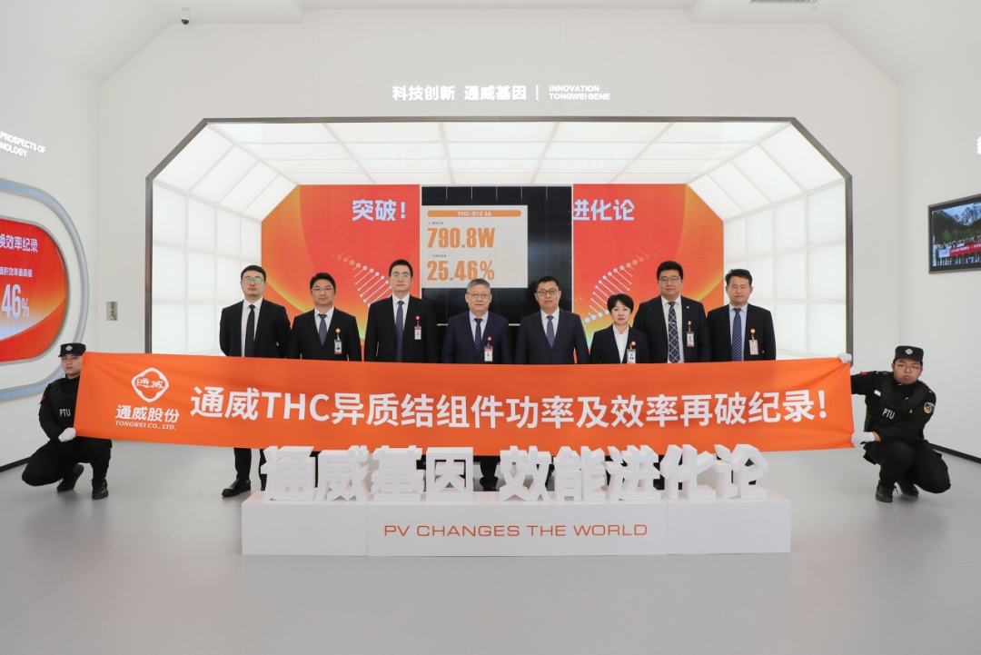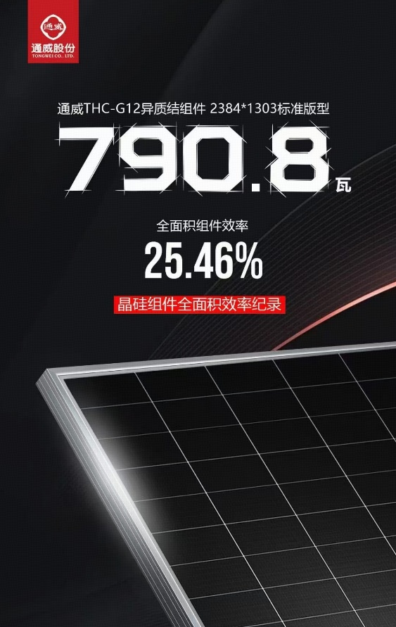 HJT技術(shù)方面,經(jīng)國際權(quán)威認(rèn)證機(jī)構(gòu)TüV測試,通威2384*1303mm標(biāo)準(zhǔn)組件尺寸THC-G12異質(zhì)結(jié)組件最高功率達(dá)到790.8W,全面積組件效率達(dá)到25.46%,創(chuàng)權(quán)威第三方測試晶硅組件全面積效率的最高值。