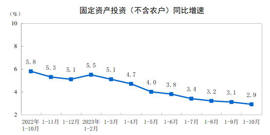 國(guó)家統(tǒng)計(jì)局11月15日發(fā)布的數(shù)據(jù)顯示,今年1~10月,全國(guó)固定資產(chǎn)投資(不含農(nóng)戶)419409億元,同比增長(zhǎng)2.9%。其中,民間固定資產(chǎn)投資215863億元,同比下降0.5%。從環(huán)比看,10月份固定資產(chǎn)投資(不含農(nóng)戶)增長(zhǎng)0.10%。