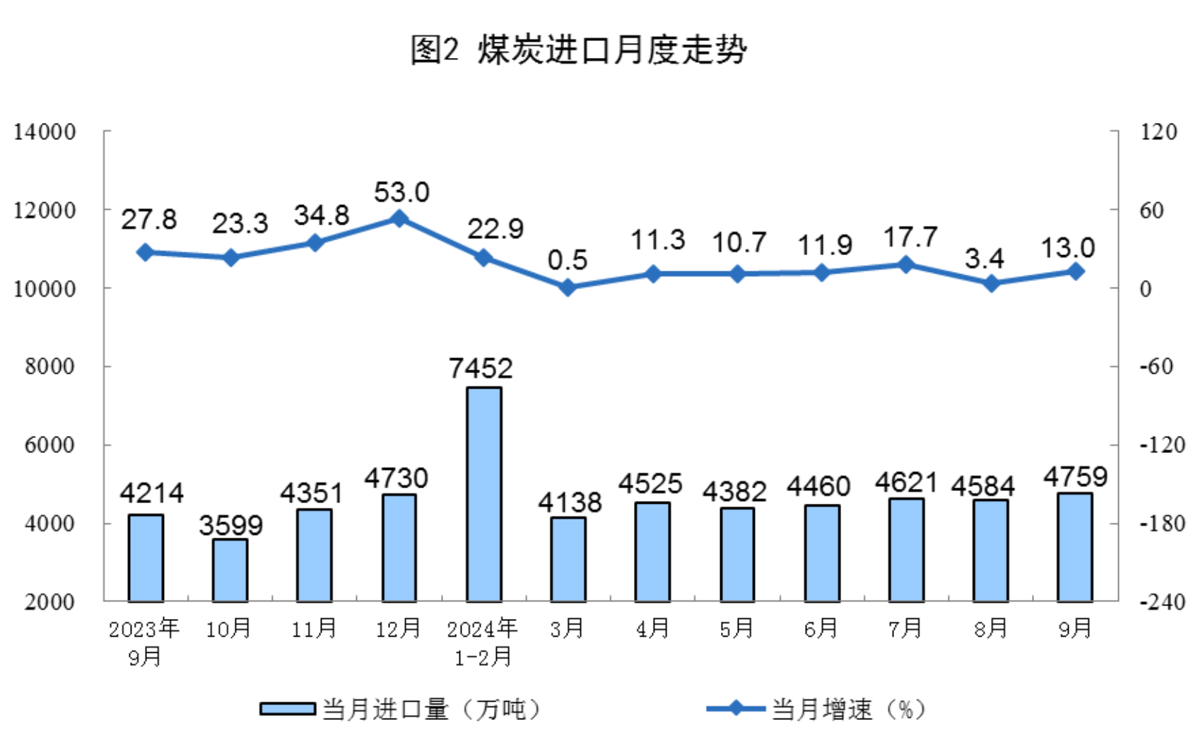 原煤生產(chǎn)增速加快。9月份,規(guī)上工業(yè)原煤產(chǎn)量4.1億噸,同比增長(zhǎng)4.4%,增速比8月份加快1.6個(gè)百分點(diǎn);日均產(chǎn)量1381.5萬(wàn)噸。進(jìn)口煤炭4759萬(wàn)噸,同比增長(zhǎng)13.0%。