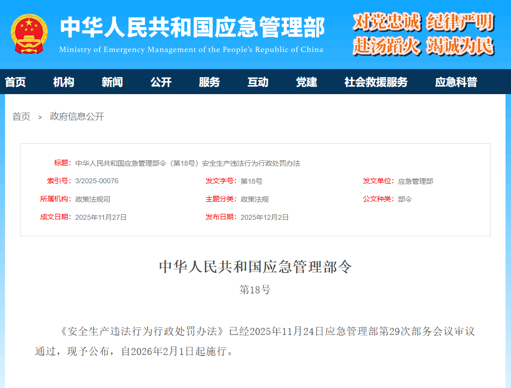 《安全生產(chǎn)違法行為行政處罰辦法》已經(jīng)2025年11月24日應(yīng)急管理部第29次部務(wù)會(huì)議審議通過,現(xiàn)予公布,自2026年2月1日起施行。