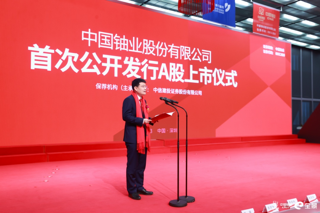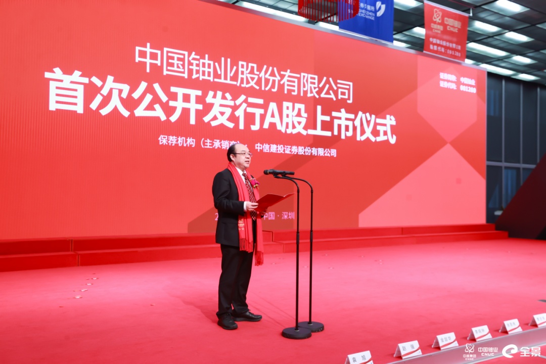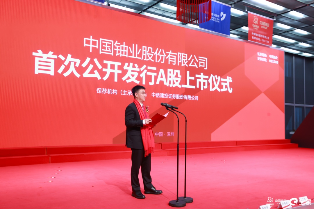 上市儀式現(xiàn)場(chǎng),中核集團(tuán)總經(jīng)理、黨組副書記張濤,國家原子能機(jī)構(gòu)系統(tǒng)工程司副司長王進(jìn)軍,中核集團(tuán)黨組成員、總會(huì)計(jì)師王學(xué)軍,中核集團(tuán)黨組成員、副總經(jīng)理陳軍利,國家產(chǎn)業(yè)基金董事長曲克波,中國國新控股有限責(zé)任公司黨委書記、董事長徐思偉,中信建投證券股份有限公司黨委副書記、總經(jīng)理金劍華,中國鈾業(yè)黨委書記、董事長袁旭一同為中國鈾業(yè)敲鐘開市。中國礦業(yè)聯(lián)合會(huì)黨委書記、會(huì)長程利偉,中國核能行業(yè)協(xié)會(huì)常務(wù)副理事長曹述棟,深圳證券交易所黨委委員、副總經(jīng)理李鳴鐘,保薦人(主承銷商)團(tuán)隊(duì)、股東與公司管理層代表、中介機(jī)構(gòu)代表以及媒體記者等共同見證了這一時(shí)刻。