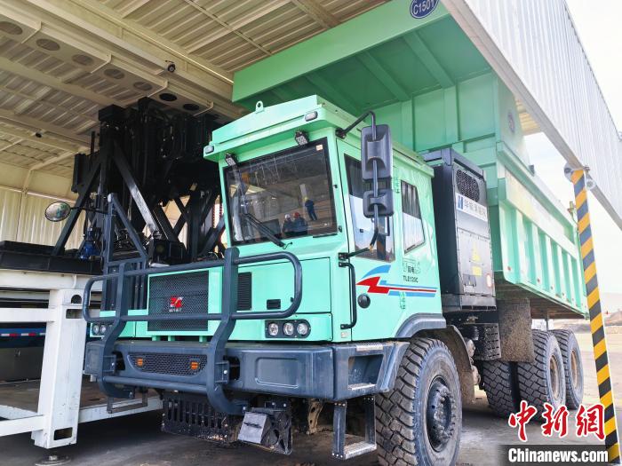 11月30日,在魏家峁露天煤礦的智能礦山,第二代“充換分離式”可移動換電站正在進行全自動無人快速更換電池。(中國華能集團供圖)