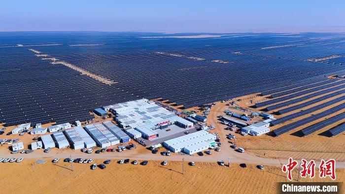 11月29日,無人機航拍視角下,內(nèi)蒙古庫布齊沙漠鄂爾多斯南部新能源基地光伏板群。(中國華能集團供圖)