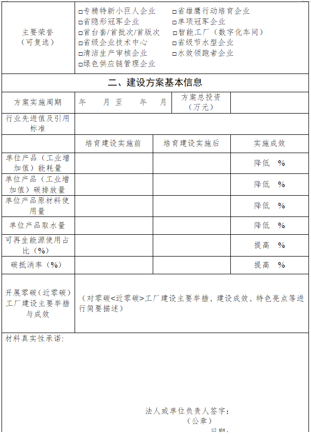 ?。ㄒ唬┙M織申報(bào)推薦。各縣(市、區(qū))經(jīng)信部門(mén)聚焦本地特色產(chǎn)業(yè),積極發(fā)動(dòng)綠色低碳基礎(chǔ)扎實(shí)、轉(zhuǎn)型升級(jí)路徑清晰、示范帶動(dòng)作用明顯的省級(jí)以上綠色(低碳)工廠(chǎng)開(kāi)展零碳(近零碳)工廠(chǎng)建設(shè)。申請(qǐng)建設(shè)的企業(yè)對(duì)照培育建設(shè)評(píng)價(jià)要求開(kāi)展自我評(píng)價(jià)(附件1),并編制零碳(近零碳)工廠(chǎng)建設(shè)方案(附件2)。各設(shè)區(qū)市經(jīng)信局對(duì)轄區(qū)申報(bào)企業(yè)的建設(shè)方案進(jìn)行審核把關(guān)后擇優(yōu)推薦,于每年3月底前行文報(bào)省經(jīng)信廳。