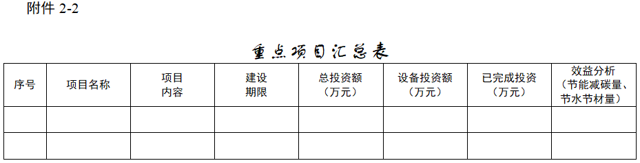 結(jié)合培育建設(shè)目標(biāo)與主要任務(wù),提出擬開(kāi)展的重點(diǎn)項(xiàng)目,包括項(xiàng)目?jī)?nèi)容、建設(shè)期限、投資額、預(yù)期的節(jié)能減碳量、節(jié)水節(jié)材量等,并說(shuō)明擬實(shí)施重點(diǎn)項(xiàng)目的技術(shù)先進(jìn)性、行業(yè)引領(lǐng)性,以及對(duì)零碳(近零碳)工廠(chǎng)培育建設(shè)工作的推動(dòng)作用和示范意義,并列出重點(diǎn)項(xiàng)目及主要設(shè)備清單(詳見(jiàn)附件2-2、附件2-3)。