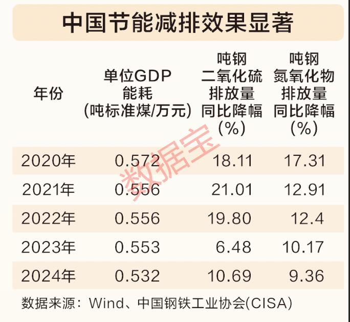 以鋼鐵行業(yè)為例,作為碳排放大戶(hù),其節(jié)能減排成果斐然。2020年至2024年,噸鋼新水消耗下降4.9%,噸鋼二氧化硫排放下降47.09%,噸鋼氮氧化物排放下降37.88%。行業(yè)龍頭寶鋼股份2023年總用水量較2020年下降11.49%,單位營(yíng)收耗水量較2020年下降27%。