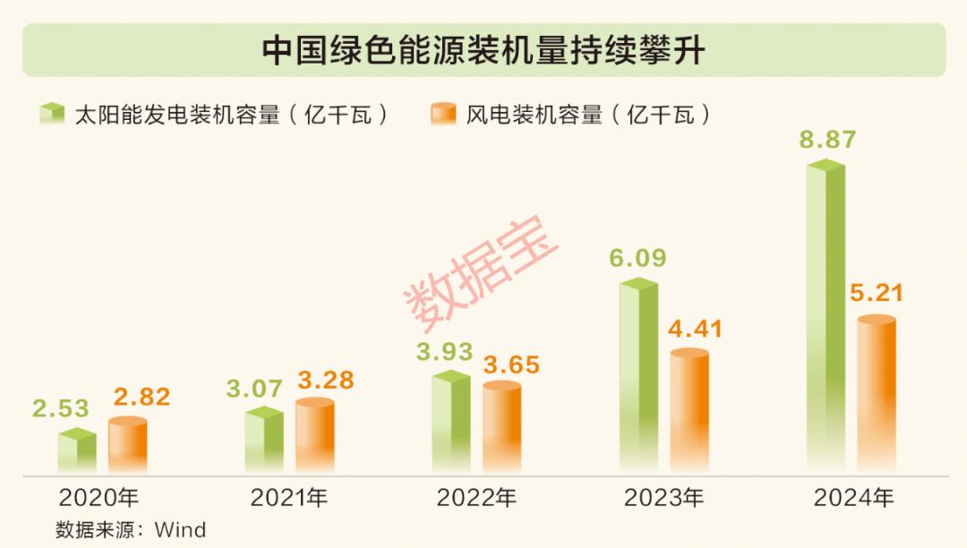 截至2024年底,我國(guó)可再生能源裝機(jī)規(guī)模達(dá)到18.89億千瓦,約占我國(guó)總裝機(jī)的56%,較“十三五”末實(shí)現(xiàn)翻倍,標(biāo)志著可再生能源已占據(jù)我國(guó)電力裝機(jī)的“半壁江山”,成為能源供應(yīng)的重要支柱。其中,風(fēng)光產(chǎn)業(yè)表現(xiàn)亮眼,2024年我國(guó)風(fēng)電、太陽(yáng)能發(fā)電量占總發(fā)電量比重分別較2020年提高3.89個(gè)和4.96個(gè)百分點(diǎn),在全球新能源供應(yīng)鏈占據(jù)核心地位。