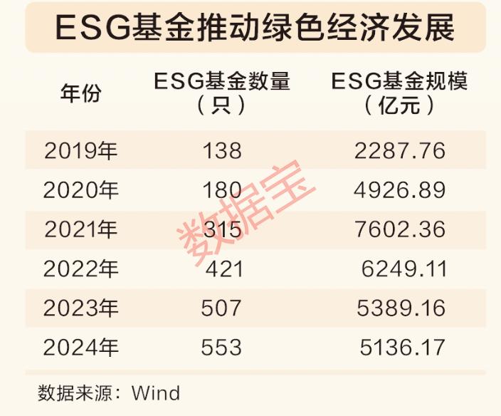 截至2024年末,國(guó)內(nèi)ESG基金總數(shù)攀升至553只,規(guī)模達(dá)5136.17億元,分別較2019年增長(zhǎng)300.72%和124.51%。
