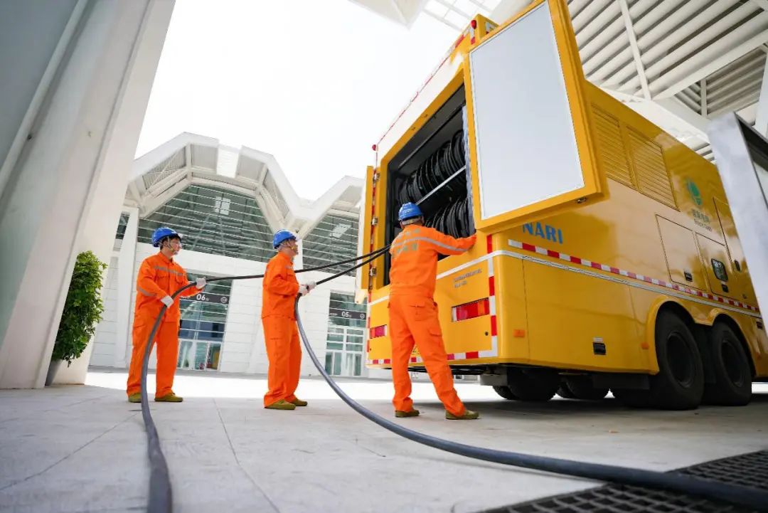 天津城南供電公司供電保障人員為國家會展中心(天津)場館接入應(yīng)急發(fā)電車。(李釗)
