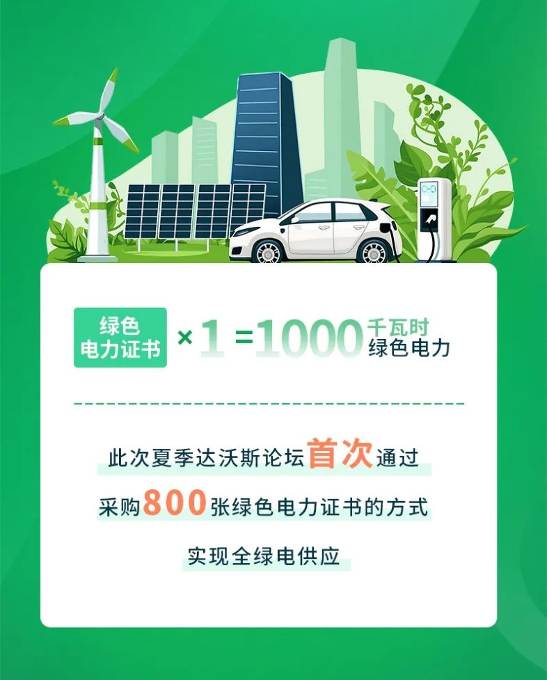 綠色電力證書是我國對可再生能源上網(wǎng)電量頒發(fā)的“電子身份證”,是綠色電力環(huán)境價值的唯一憑證,1張綠證對應(yīng)1000千瓦時的綠色電力。此次夏季達沃斯論壇首次通過采購800張綠色電力證書的方式實現(xiàn)全綠電供應(yīng),是國內(nèi)綠證近期獲得國際供應(yīng)鏈全面認可后的一次重要的活動實踐,將為企業(yè)多途徑參與綠色消費起到積極示范作用。