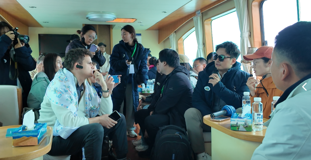 7月1日,記者在青海湖游船上提問。新華社記者陸君鈺攝