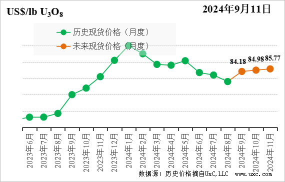 今年以來(lái),鈾價(jià)整體呈波動(dòng)走勢(shì),在1月達(dá)到高點(diǎn)后出現(xiàn)下滑趨勢(shì)。核工業(yè)市場(chǎng)研究公司UxC的數(shù)據(jù)顯示,截至9月9日的當(dāng)周,八氧化三鈾現(xiàn)貨價(jià)格為79.75美元/磅。