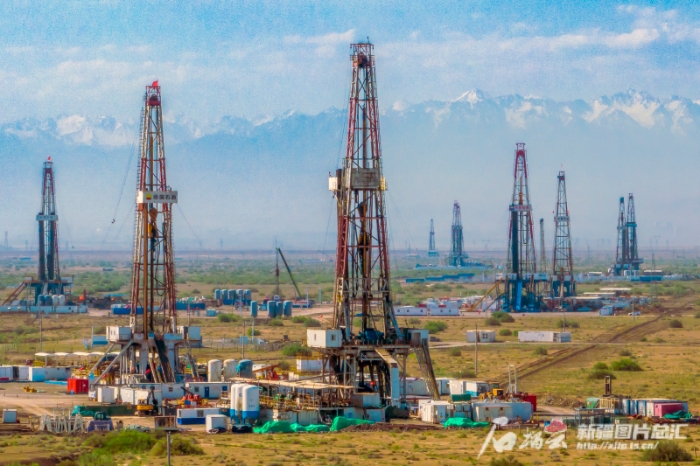 2023年6月8日,在新疆油田公司吉慶油田作業(yè)區(qū),鉆井聳立在天山腳下。閔勇攝