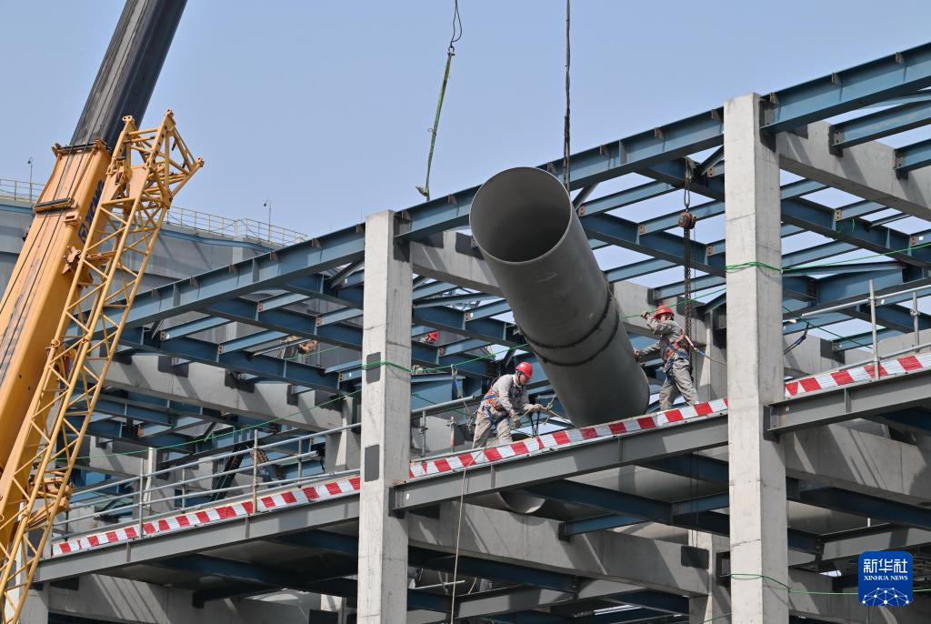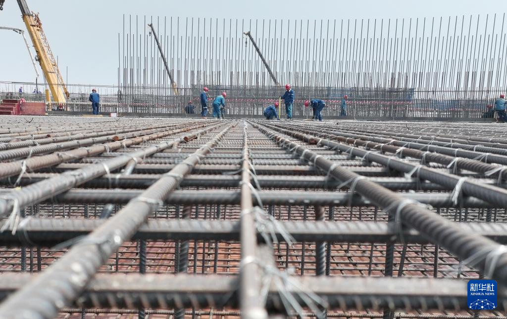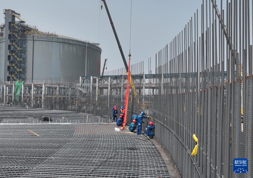 ??4月17日,工人在唐山市曹妃甸新天LNG接收站項(xiàng)目建設(shè)工地施工。