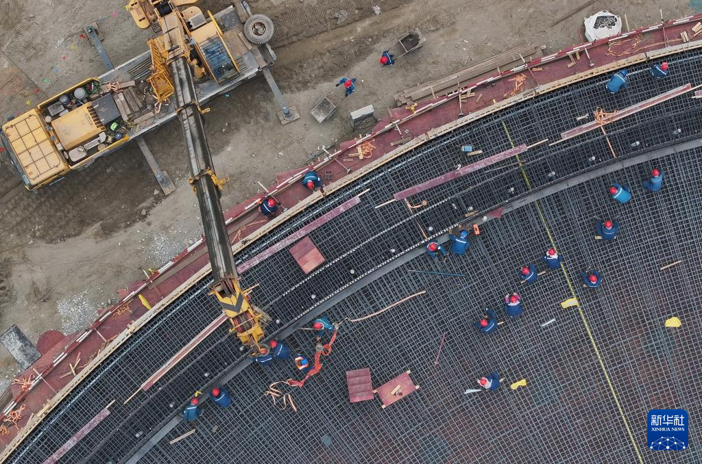 ??4月17日,工人在唐山市曹妃甸新天LNG接收站項(xiàng)目建設(shè)工地施工(無(wú)人機(jī)照片)。
