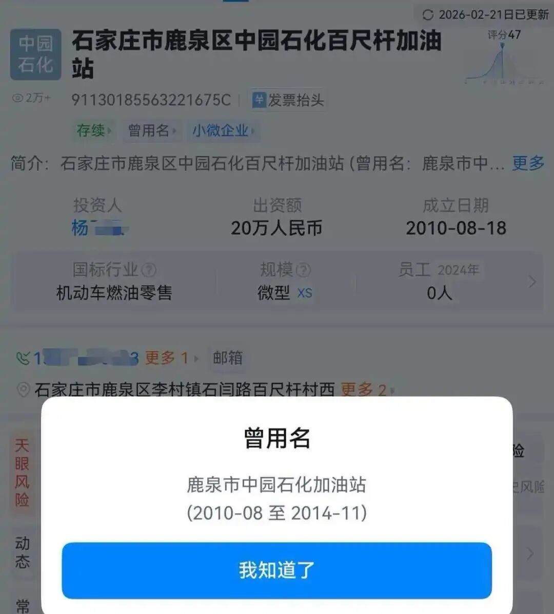 據(jù)極目新聞,記者查詢天眼查發(fā)現(xiàn),該加油站為石家莊市鹿泉區(qū)中園石化百尺桿加油站,曾用名為鹿泉市中園石化加油站。