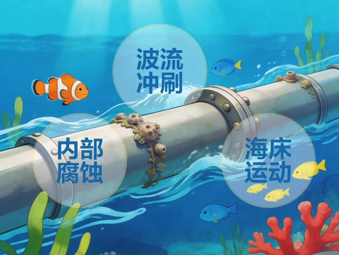 讓我們把目光投向深海,在那里,你可以看到海管的內部腐蝕,看到外部波流對它的沖刷,看到海床運動對它日復一日的影響……諸多因素的共同作用下,就算是“鋼”打的管道也不可避免地隨著時光流逝慢慢走向“衰老”。