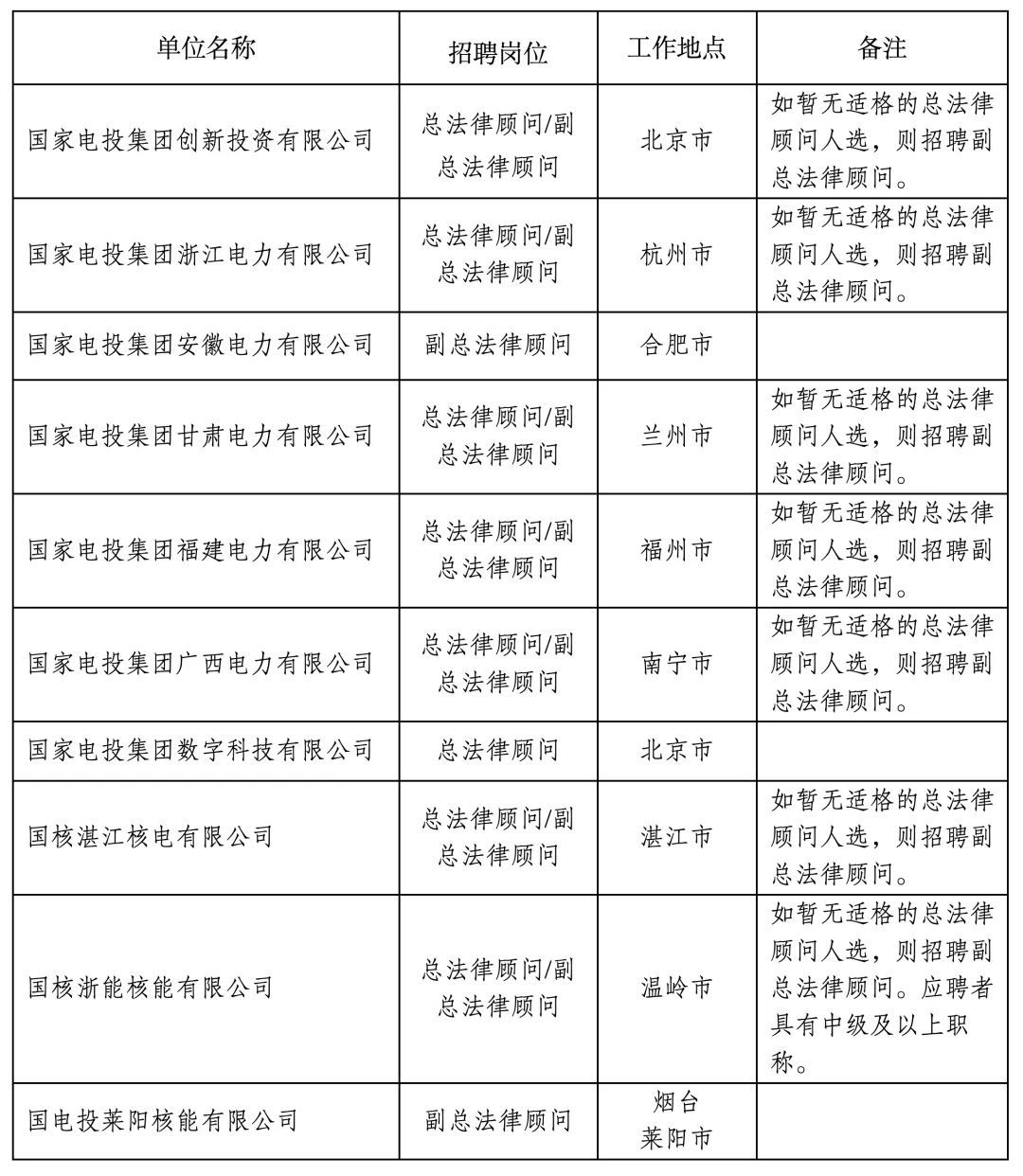 根據(jù)工作需要,國(guó)家電投集團(tuán)所屬部分二級(jí)單位面向系統(tǒng)內(nèi)外公開招聘總法律顧問或副總法律顧問(副總法律顧問只面向系統(tǒng)內(nèi)招聘)?,F(xiàn)將具體事項(xiàng)公告如下。
