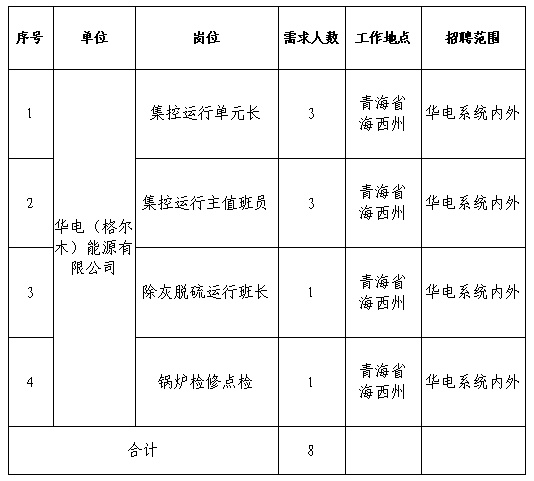 華電(格爾木)能源有限公司于2023年8月成立注冊成立。目前,主要負責開發(fā)青海省格爾木2*660MW煤電項目,該項目現(xiàn)已列為青海省2023年重點項目計劃,項目位于格爾木市東南約8km(直線距離)開發(fā)區(qū)內(nèi),項目建設(shè)規(guī)模為2*660MW空冷燃煤機組,于2023年9月開工建設(shè),計劃2026年投產(chǎn)。為滿足企業(yè)發(fā)展和生產(chǎn)運營需要,公司面向華電系統(tǒng)內(nèi)外公開招聘8名工作人員?,F(xiàn)將有關(guān)事項公告如下: