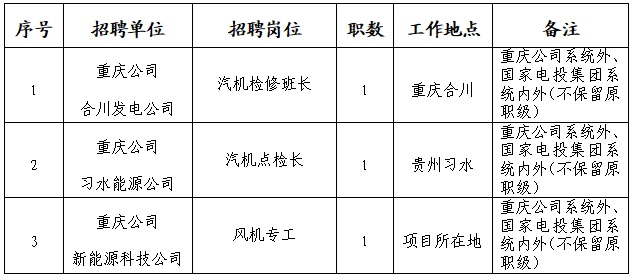 按照員工招聘有關(guān)規(guī)定,重慶公司所屬相關(guān)單位面向國家電投集團系統(tǒng)內(nèi)外公開招聘,具體事項如下: