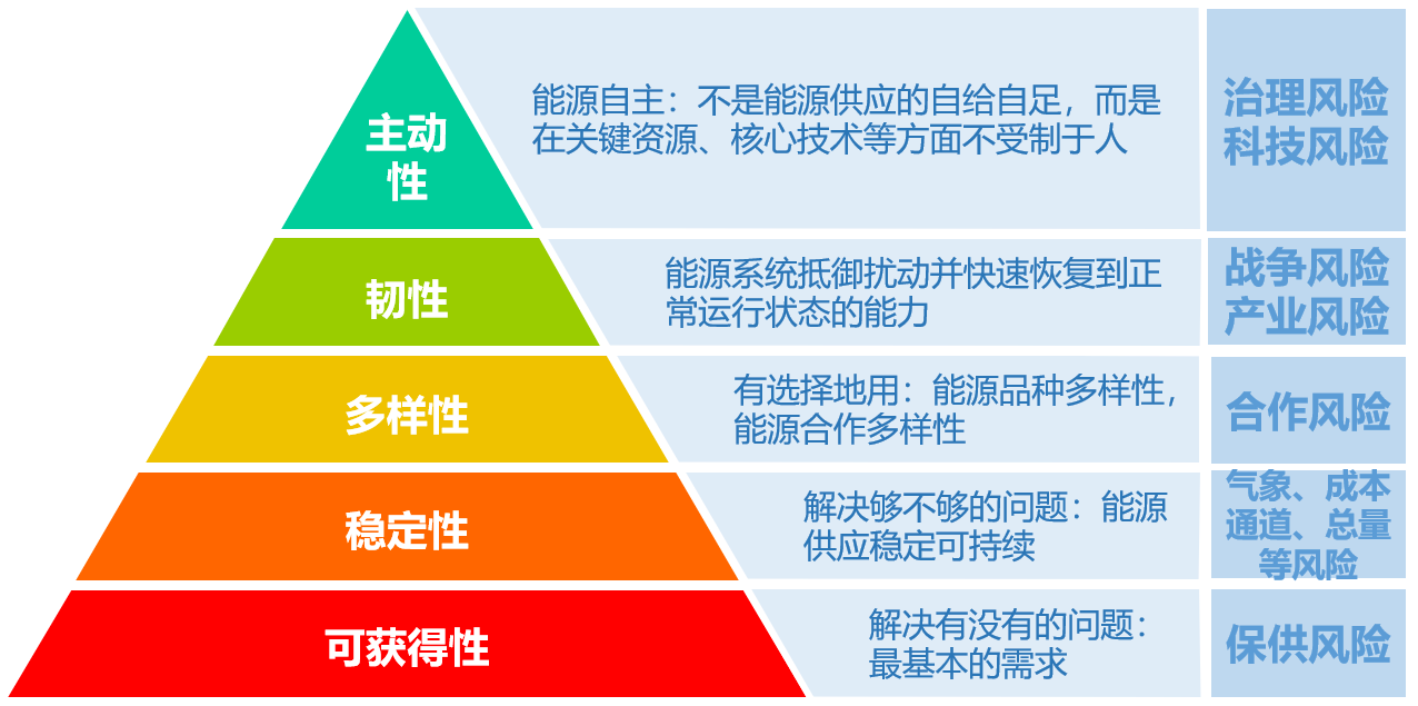 認識二:我國能源安全的內(nèi)涵與外延持續(xù)擴展,向體系化安全迭代演進。由于影響能源安全的內(nèi)外部因素持續(xù)加速演進,涉及的行業(yè)與學科不斷增加,研究角度日益多元,能源安全的內(nèi)涵與外延相應擴展、動態(tài)變化。如IEA提出的以能源供給的穩(wěn)定可靠、無虞中斷、價格合理為主,拓展為關注資源安全、氣象安全、科技安全、生態(tài)安全、經(jīng)濟安全、網(wǎng)絡安全、合作安全等能源外延安全。隨著能源進入“不安全”時代,安全內(nèi)涵進一步向體系化演進。