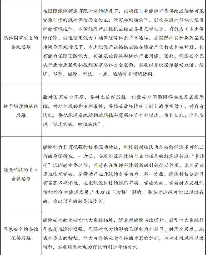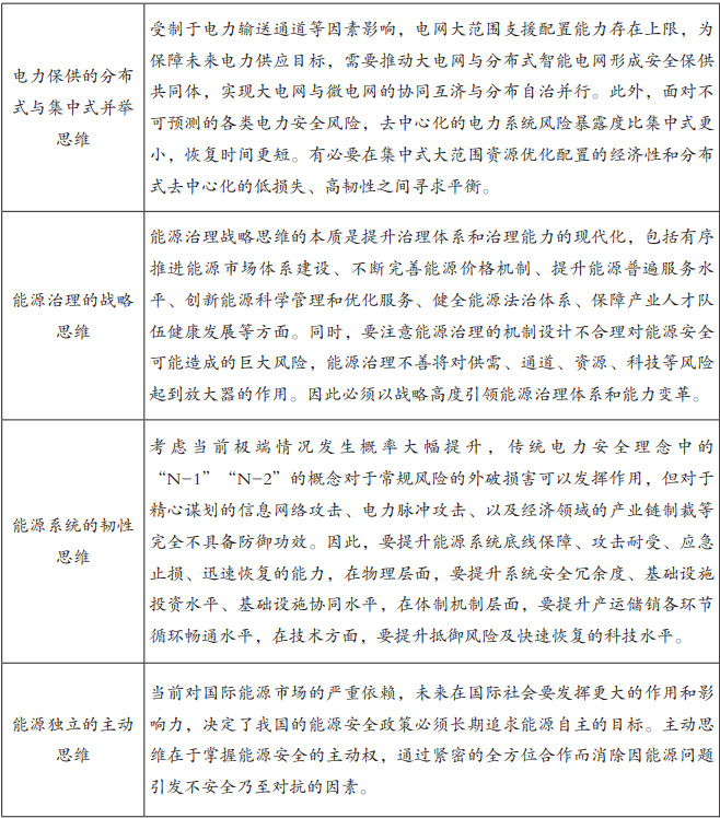 認識五:新型能源發(fā)展觀下,認識和管理能源安全風險的思維發(fā)生深刻變化。從以行業(yè)專業(yè)層面的剛性保供思維為主,發(fā)展到總體國家安全的系統(tǒng)思維、戰(zhàn)爭場景的底線思維、能源科技的自立自強思維、氣象安全風險的柔性保供思維、電力保供的分布式與集中式并舉思維、能源治理的戰(zhàn)略思維、能源系統(tǒng)的韌性思維、能源自主的主動思維。