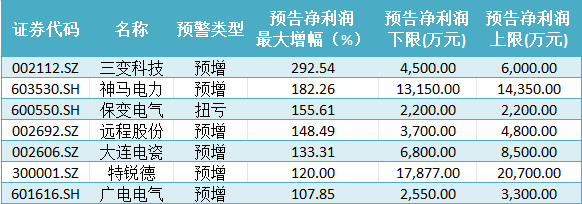 據(jù)Wind統(tǒng)計,隸屬于電力設(shè)備行業(yè)的15只預(yù)喜股中,7只預(yù)告凈利潤最大增幅超過100%,其中三變科技凈利潤同比增近300%,業(yè)績表現(xiàn)一騎絕塵;保變電氣業(yè)績扭虧,凈利潤同比增超155%;平高電氣預(yù)盈總額最高,凈利潤有望實現(xiàn)5.2億元至5.4億元。