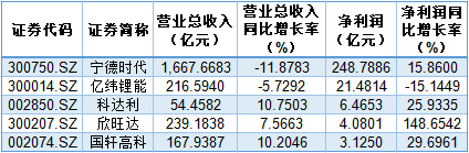 頭部企業(yè)中,寧德時代新能源科技股份有限公司(以下簡稱“寧德時代”)盈利增長,深圳市科達利實業(yè)股份有限公司、國軒高科股份有限公司(以下簡稱“國軒高科”)業(yè)績上行,欣旺達電子股份有限公司(以下簡稱“欣旺達”)凈利潤同比翻倍,顯示出相對更強的盈利能力。