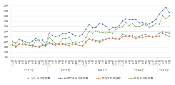 在關(guān)稅陰霾籠罩和外部環(huán)境復(fù)雜嚴(yán)峻的背景下,5月全國全社會(huì)用電量依然強(qiáng)勢增長,雖然一二產(chǎn)業(yè)用電量增速回落,但第三產(chǎn)業(yè)及城鄉(xiāng)居民生活用電量保持了較高的增速,特別是第三產(chǎn)業(yè)增長速度勢頭強(qiáng)勁,預(yù)示著我國經(jīng)濟(jì)結(jié)構(gòu)進(jìn)一步向服務(wù)業(yè)轉(zhuǎn)型的趨勢。根據(jù)中電聯(lián)發(fā)布的全國電力消費(fèi)系列指數(shù)(CNECI),2025年5月,全國全行業(yè)用電指數(shù)為137.5,全行業(yè)用電量比2020年基期(以2020年基期為100)增長了37.5%,年均增長6.6%,同比增長3.7%。與前一月相比,交通運(yùn)輸、信息軟件、住宿餐飲、充換電等服務(wù)業(yè)用電指數(shù)均有所增長。中國經(jīng)濟(jì)高質(zhì)量發(fā)展態(tài)勢持續(xù),經(jīng)濟(jì)的韌性和潛力正在持續(xù)顯現(xiàn)。