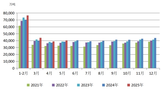 圖1 2021—2025年月度規(guī)模以上工業(yè)原煤產(chǎn)量