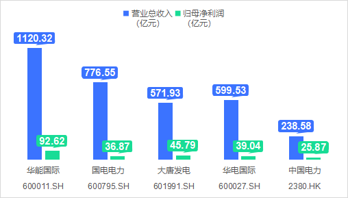其中,華能國際以營收1120.32億元、歸母凈利潤92.62億元高居榜首,成為五大企業(yè)中唯一營收破千億、盈利近百億的上市公司。