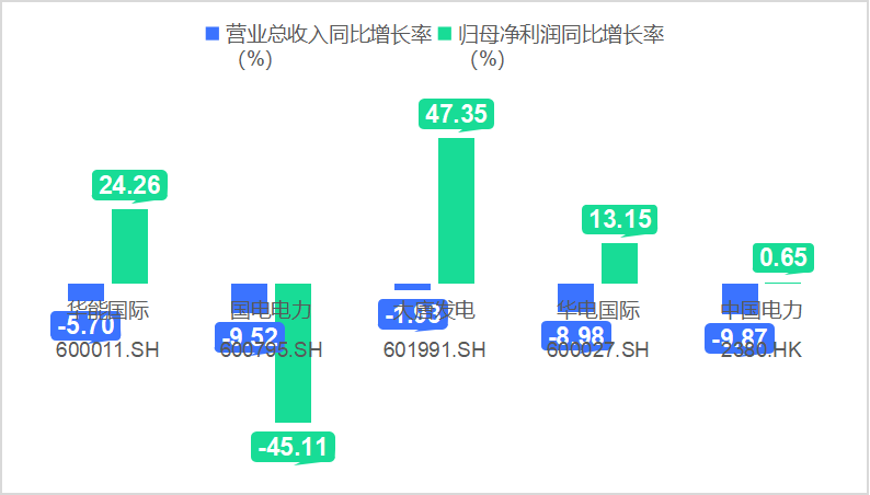 聚焦業(yè)績增速,上半年五大電力上市公司營收同比增長率全部下降;盈利成長性方面,華能國際、大唐發(fā)電、華電國際、中國電力均出現(xiàn)不同程度的增長。