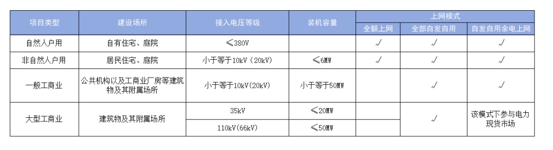 《管理辦法》將分布式光伏發(fā)電項目按照建設(shè)場所、接入電壓等級和裝機容量,細分為自然人戶用、非自然人戶用、一般工商業(yè)、大型工商業(yè)四種類型,全額上網(wǎng)、全部自發(fā)自用和自發(fā)自用余電上網(wǎng)三種上網(wǎng)模式。其中,自然人戶用、非自然人戶用分布式光伏項目三種上網(wǎng)模式可任選,一般工商業(yè)分布式光伏項目在全部自發(fā)自用、自發(fā)自用余電上網(wǎng)中二選一,大型工商業(yè)分布式光伏項目原則上選擇全部自發(fā)自用模式(在電力現(xiàn)貨市場連續(xù)運行地區(qū),大型工商業(yè)分布式光伏可通過自發(fā)自用余電上網(wǎng)模式參與現(xiàn)貨市場)。