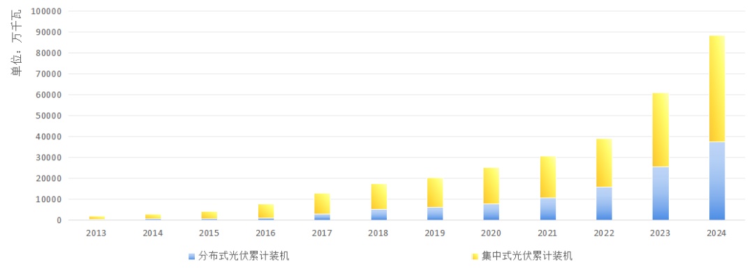 據(jù)國家能源局公布數(shù)據(jù),在我國光伏行業(yè)發(fā)展之初的2013年,我國分布式光伏裝機容量約310萬千瓦,在全部光伏發(fā)電裝機中占比16%;2024年底,分布式光伏累計裝機達到了2013年的121倍,約3.7億千瓦,占全部光伏發(fā)電裝機的比重達到了42%,幾乎占據(jù)了整個光伏發(fā)電的半壁江山。