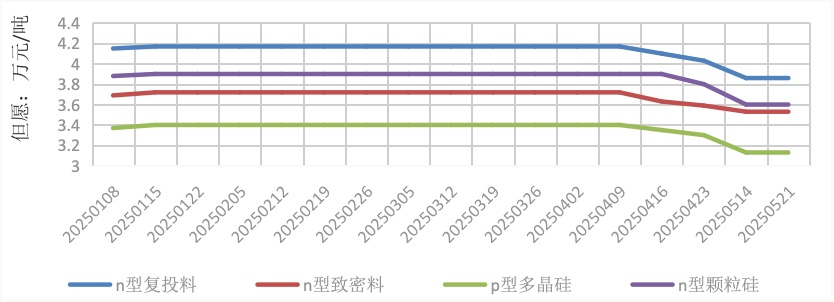 進入5月,多晶硅現(xiàn)貨市場成交量較少?!?30”過后市場需求大幅降低,市場成交價格隨之小幅下滑。截至5月21日,n型復(fù)投料成交價格區(qū)間為3.6萬~4.1萬元/噸,成交均價為3.86萬元/噸;n型顆粒硅成交價格區(qū)間為3.5萬~3.7萬元/噸,成交均價為3.6萬元/噸;p型多晶硅成交價格區(qū)間為3萬~3.5萬元/噸,成交均價為3.13萬元/噸。