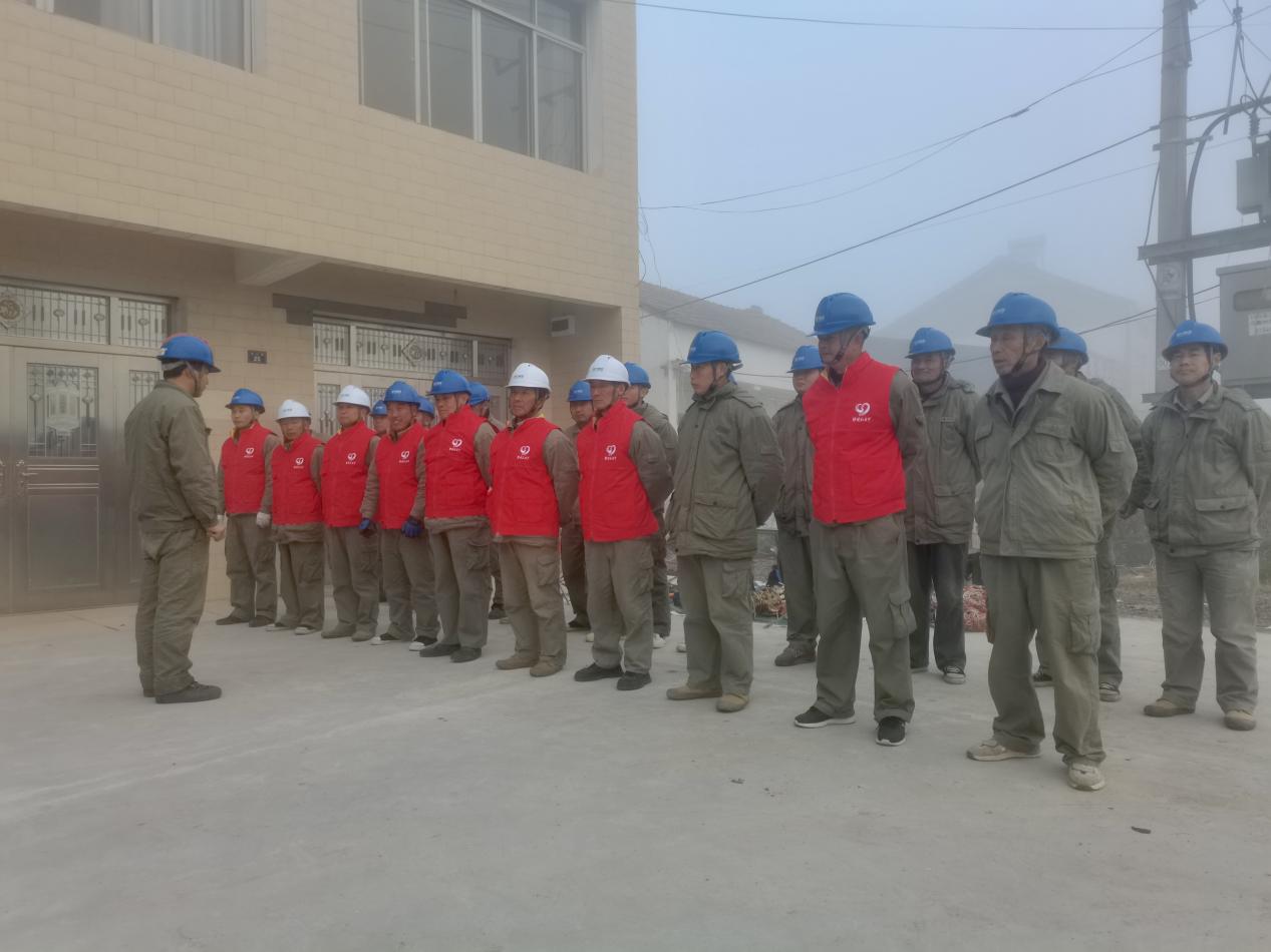 1月15日清晨,在馬家寨鄉(xiāng)直線,60余名電力施工人員正在召開班前會(huì),他們分成四個(gè)班組,沿著10千伏鄉(xiāng)直線分別開展電桿金具安裝、拉線制作、線路分?jǐn)?、電纜敷設(shè)等14項(xiàng)工作。
